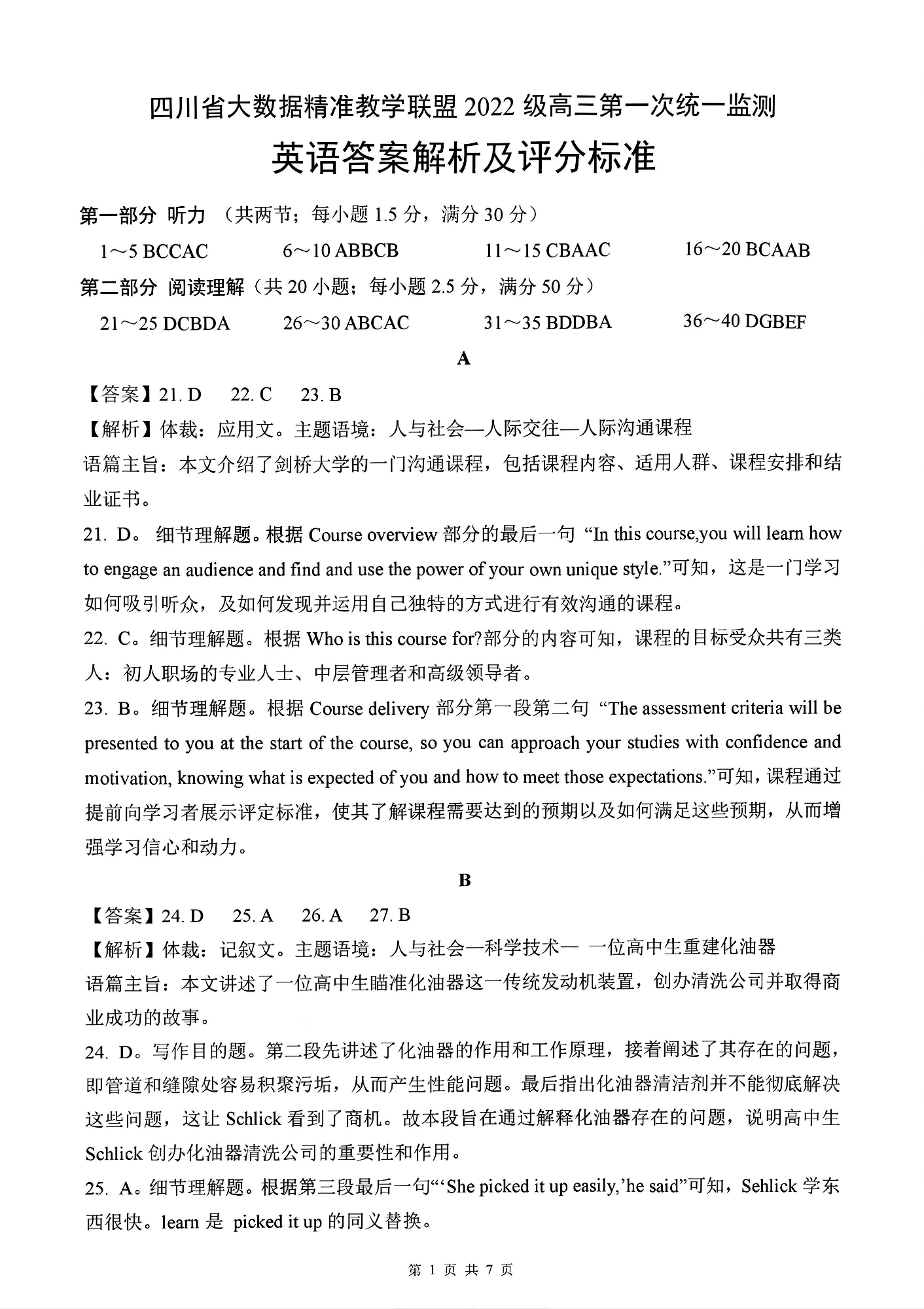 四川省大数据精准教学联盟2022级高三第一次统一检测英语答案