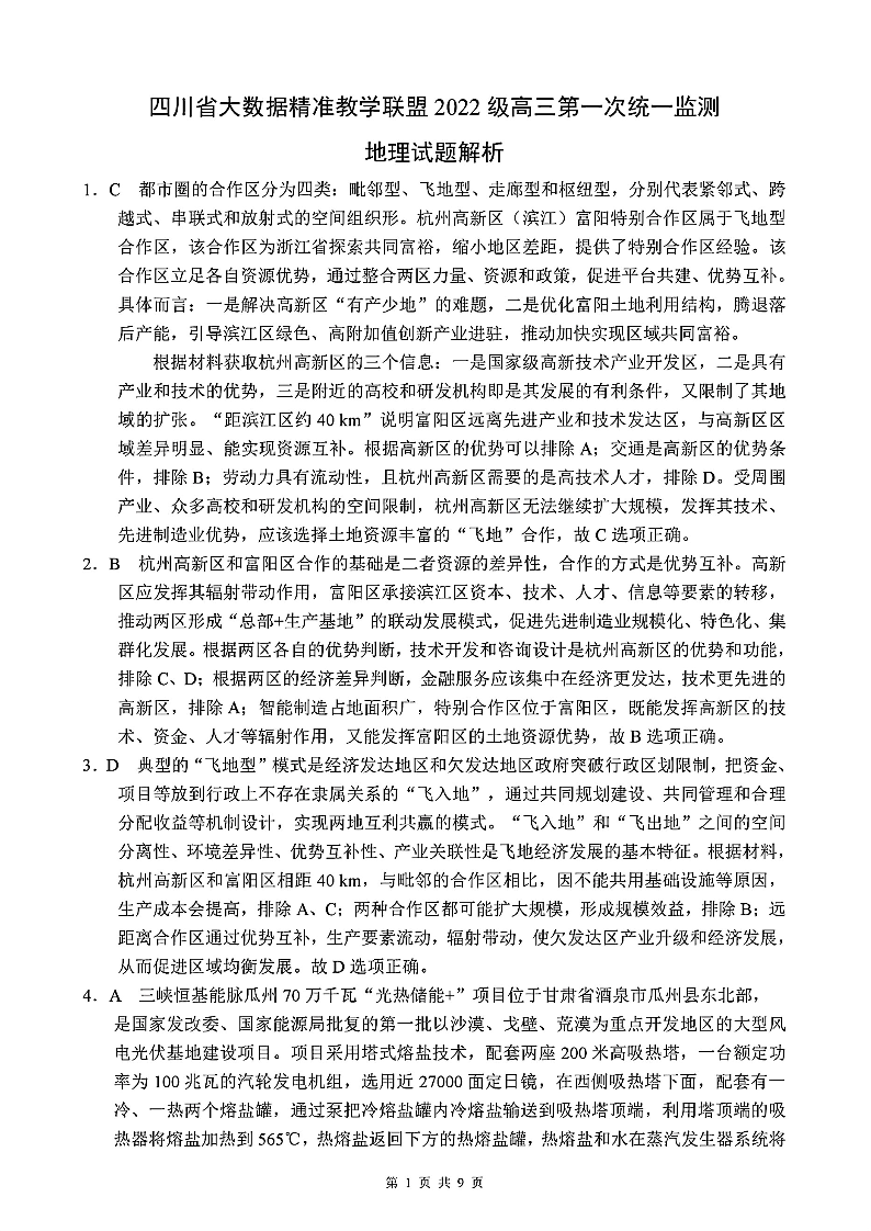 四川省大数据精准教学联盟2022级高三第一次统一检测地理答案