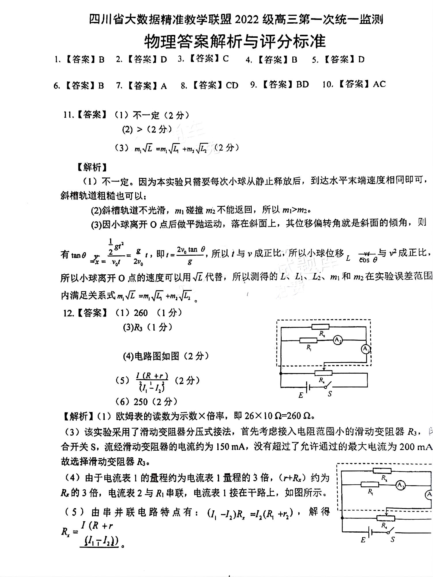 四川省大数据精准教学联盟2022级高三第一次统一检测物理答案