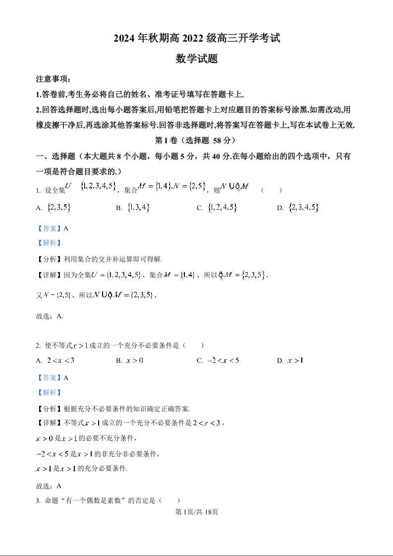 四川省泸州市叙永第一中学校高2022级高三上学期开学考试数学试题(解析版)