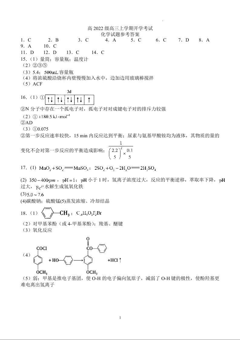 四川省泸州市叙永第一中学校高2022级高三上学期开学考试化学答案