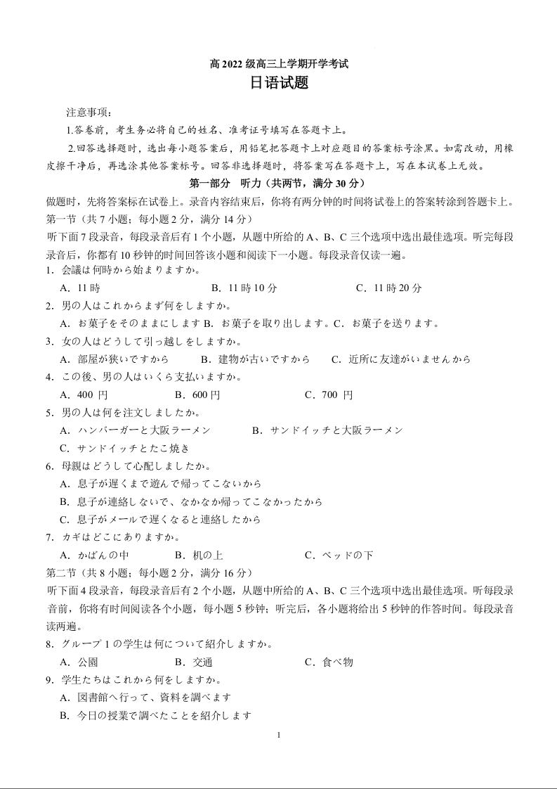 四川省泸州市叙永第一中学校高2022级高三上学期开学考试日语