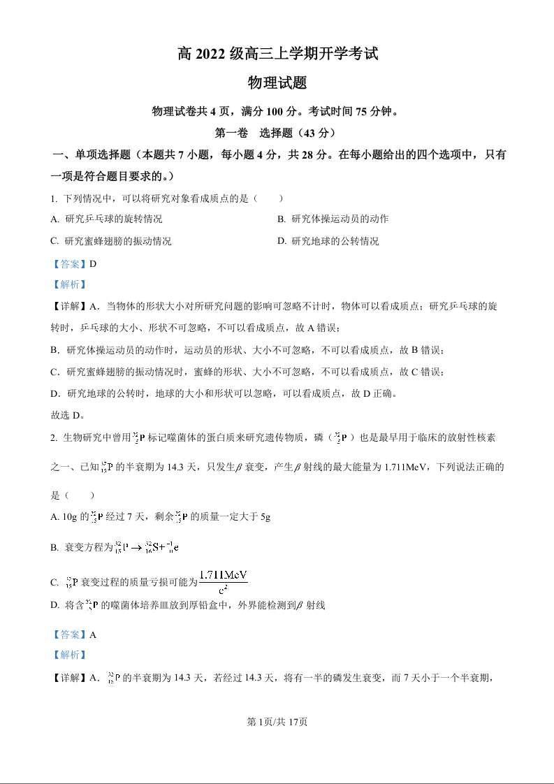 四川省泸州市叙永第一中学校高2022级高三上学期开学考试物理试题(解析版)