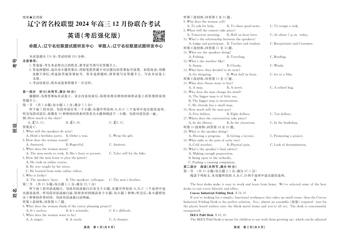辽宁名校联盟2024年高三12月联考(考后强化版)英语