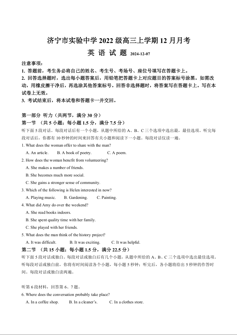 山东省济宁市实验中学2025届高三上学期12月月考英语+答案
