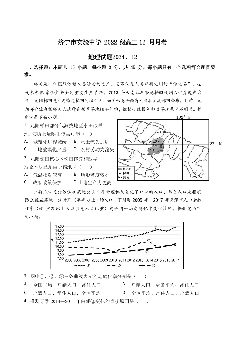 山东省济宁市实验中学2025届高三上学期12月月考地理+答案