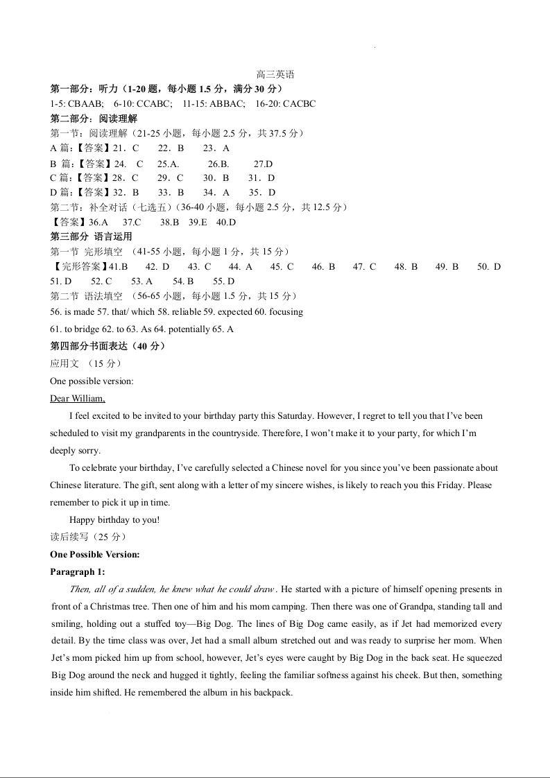 四川省成都列五中学2025届高三上学期12月月考英语答案