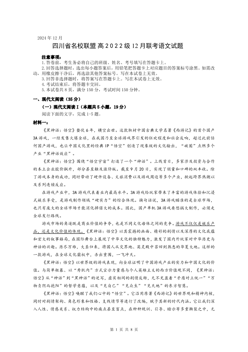 四川省名校联盟2025届高三12月联考语文