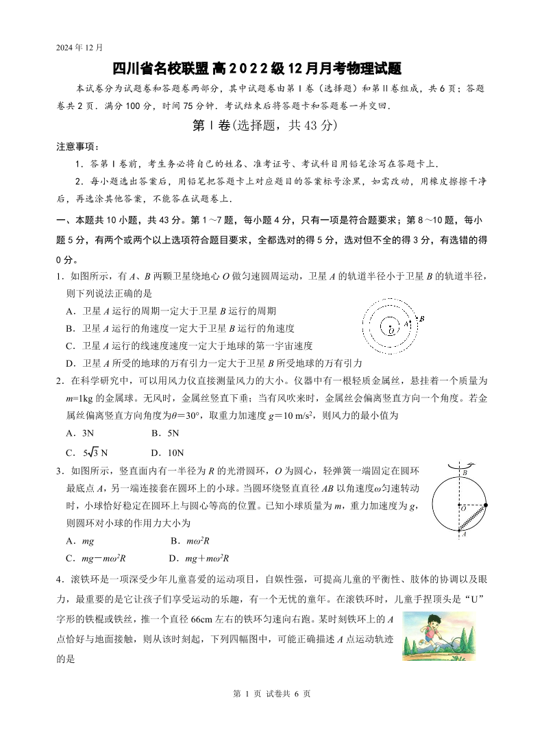 四川省名校联盟2025届高三12月联考物理