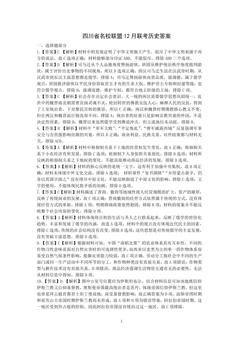 四川省名校联盟2025届高三12月联考历史答案