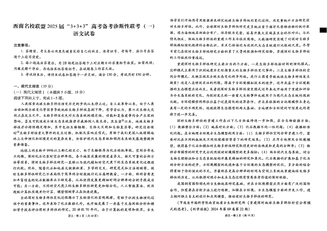 西南名校联盟 2025届 “3+3+3”高考备考诊断性联考(一)语文