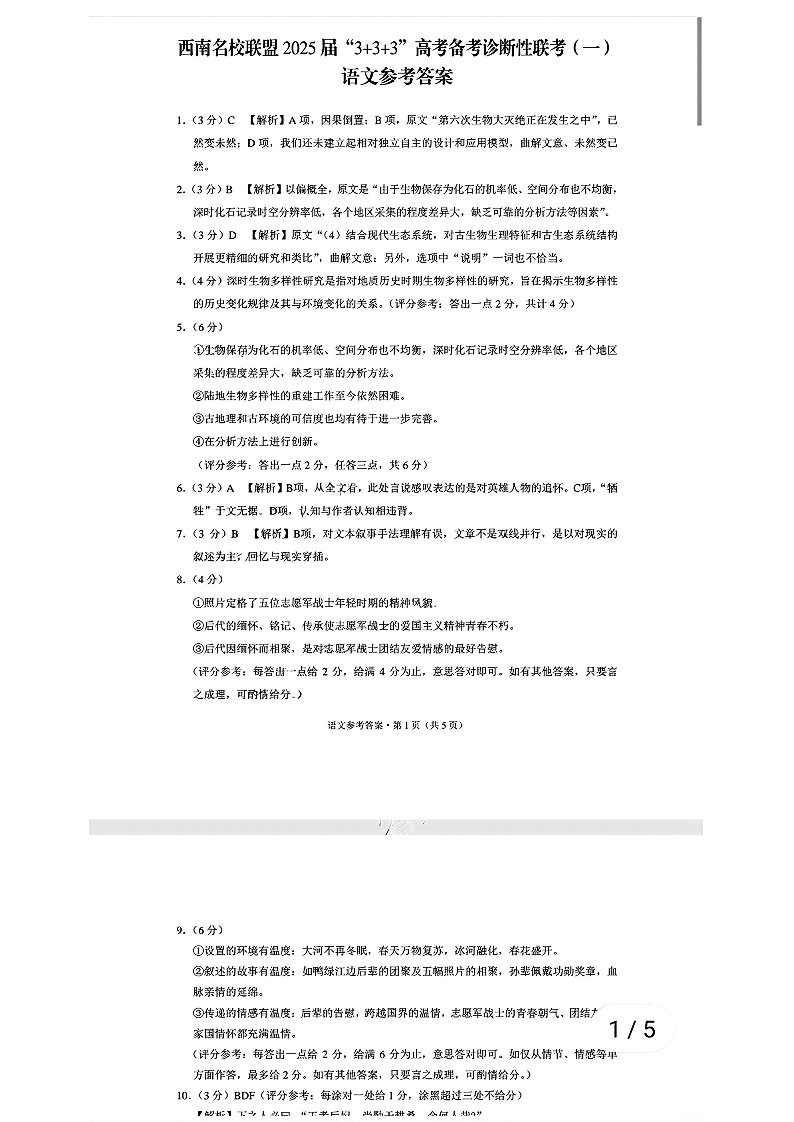 西南名校联盟 2025届 “3+3+3”高考备考诊断性联考(一)语文答案