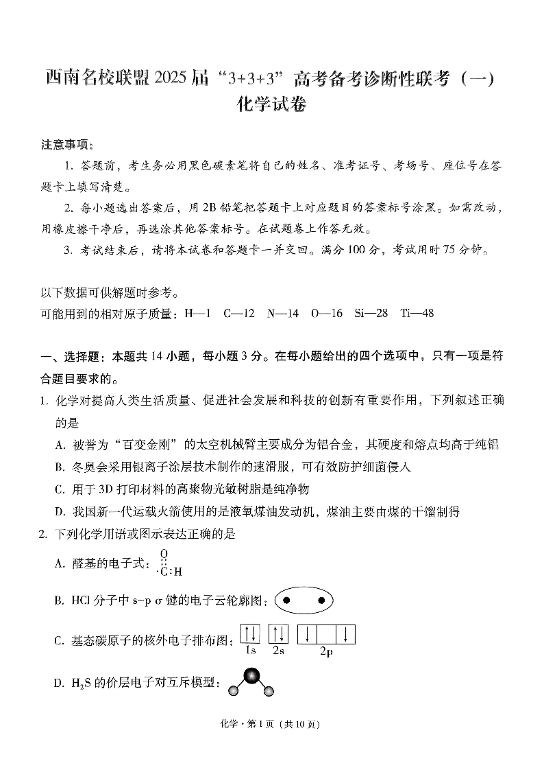 西南名校联盟2025届“3+3+3“高考备考诊断性联考(一)化学