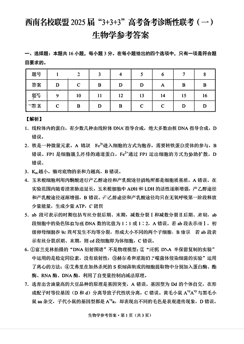 西南名校联盟2025届“3+3+3“高考备考诊断性联考(一)生物答案