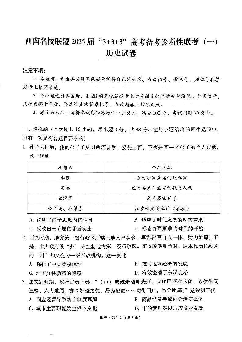 西南名校联盟 2025届 “3+3+3”高考备考诊断性联考(一)历史