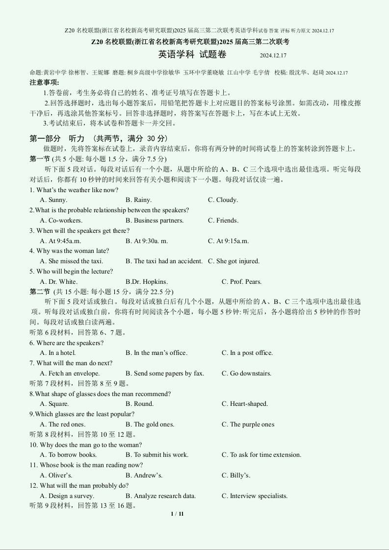 浙江省Z20名校联盟2025届高三上学期第二次联考英语
