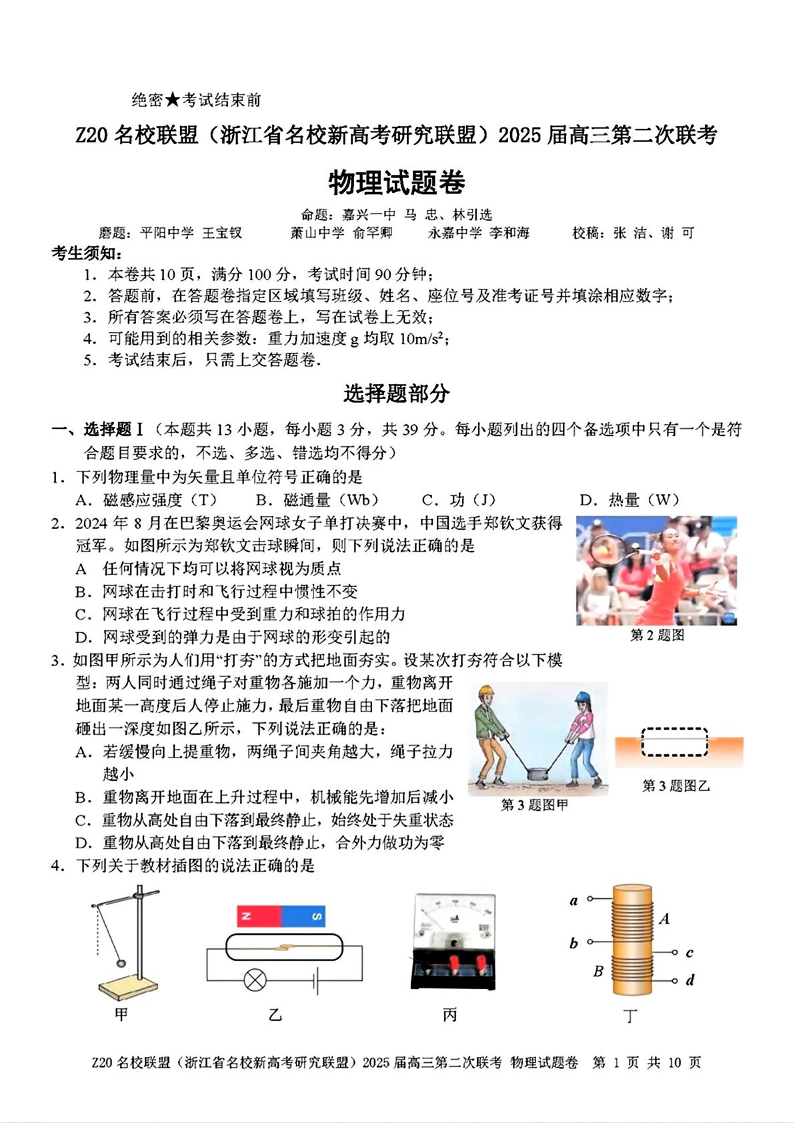 浙江省Z20名校联盟2025届高三上学期第二次联考物理