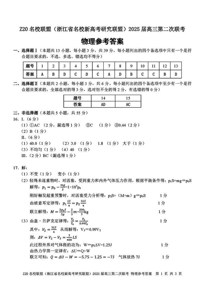 浙江省Z20名校联盟2025届高三上学期第二次联考物理答案