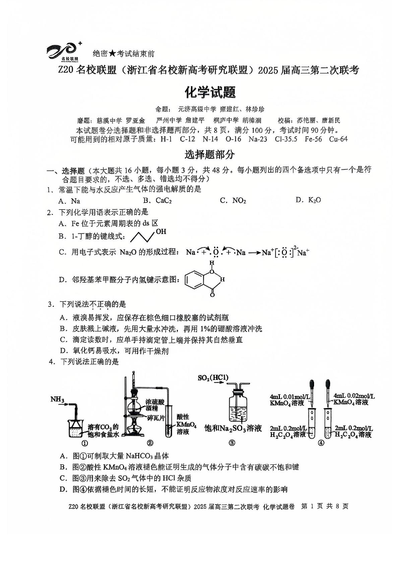 浙江省Z20名校联盟2025届高三上学期第二次联考化学