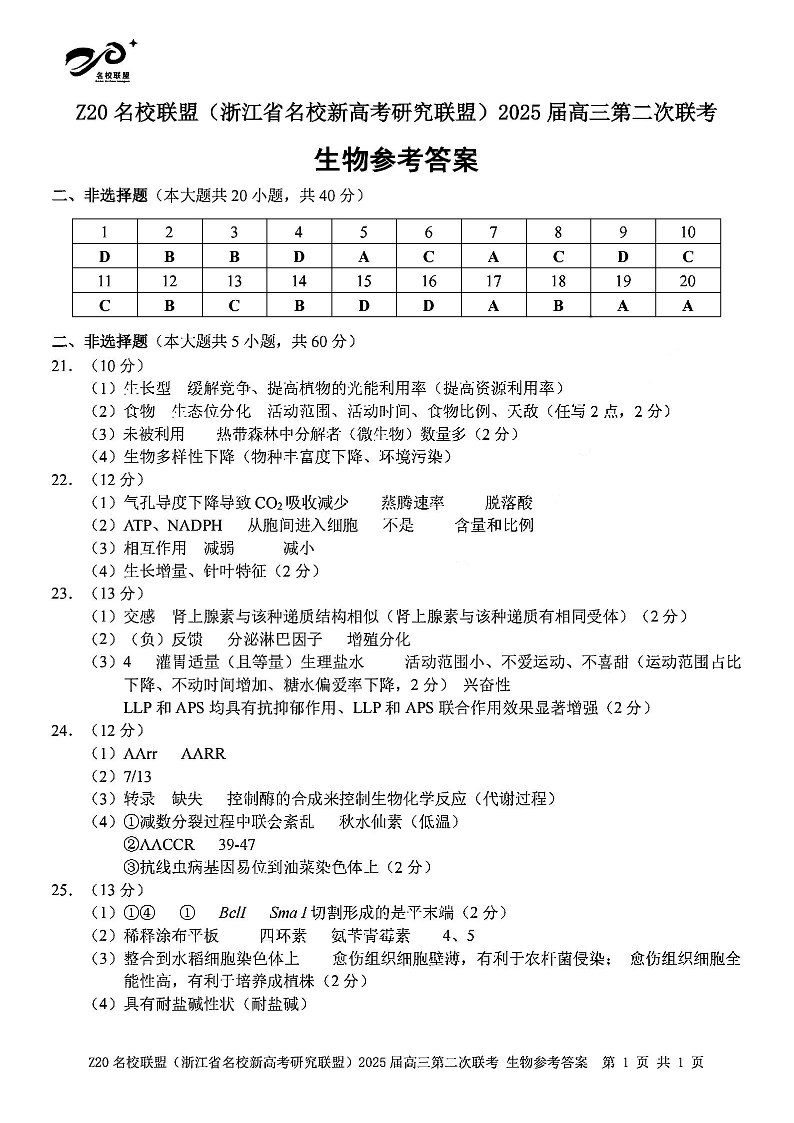 浙江省Z20名校联盟2025届高三上学期第二次联考生物答案