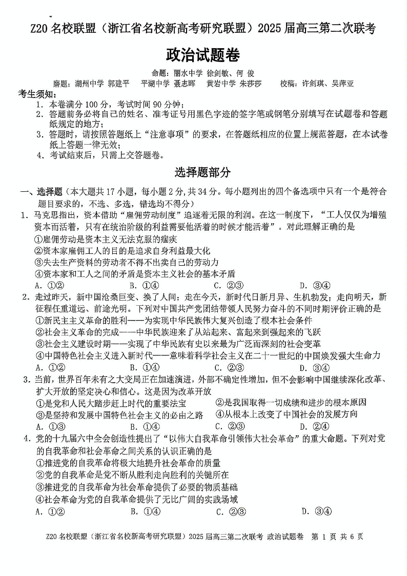 浙江省Z20名校联盟2025届高三上学期第二次联考政治