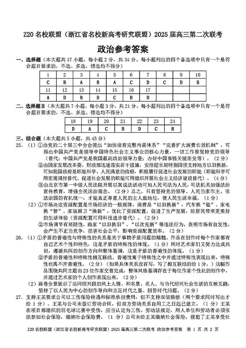 浙江省Z20名校联盟2025届高三上学期第二次联考政治答案