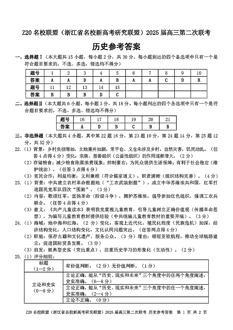 浙江省Z20名校联盟2025届高三上学期第二次联考历史答案