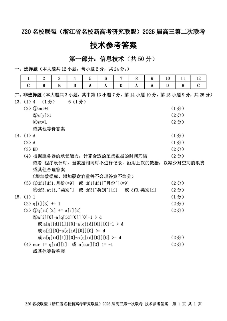 浙江省Z20名校联盟2025届高三上学期第二次联考技术答案
