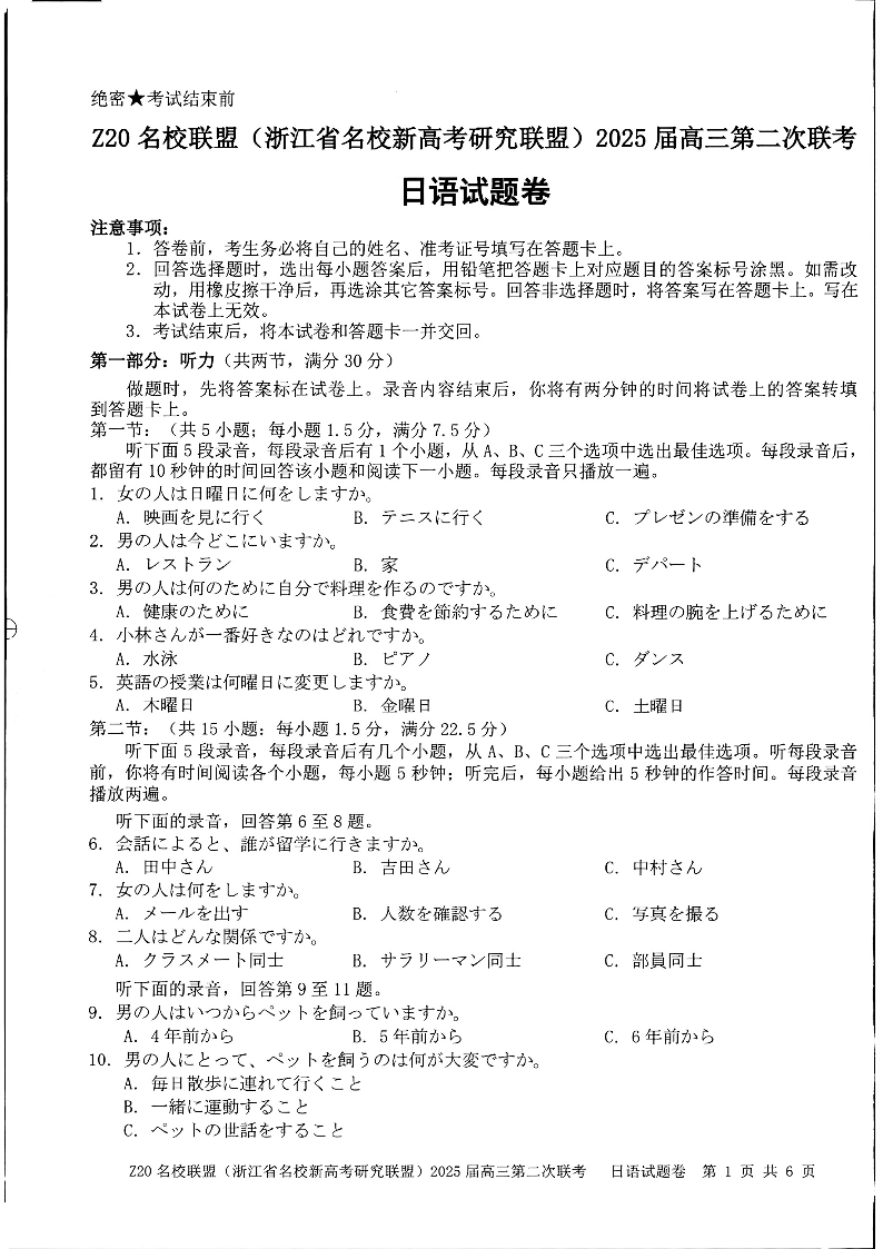 浙江省Z20名校联盟2025届高三上学期第二次联考日语