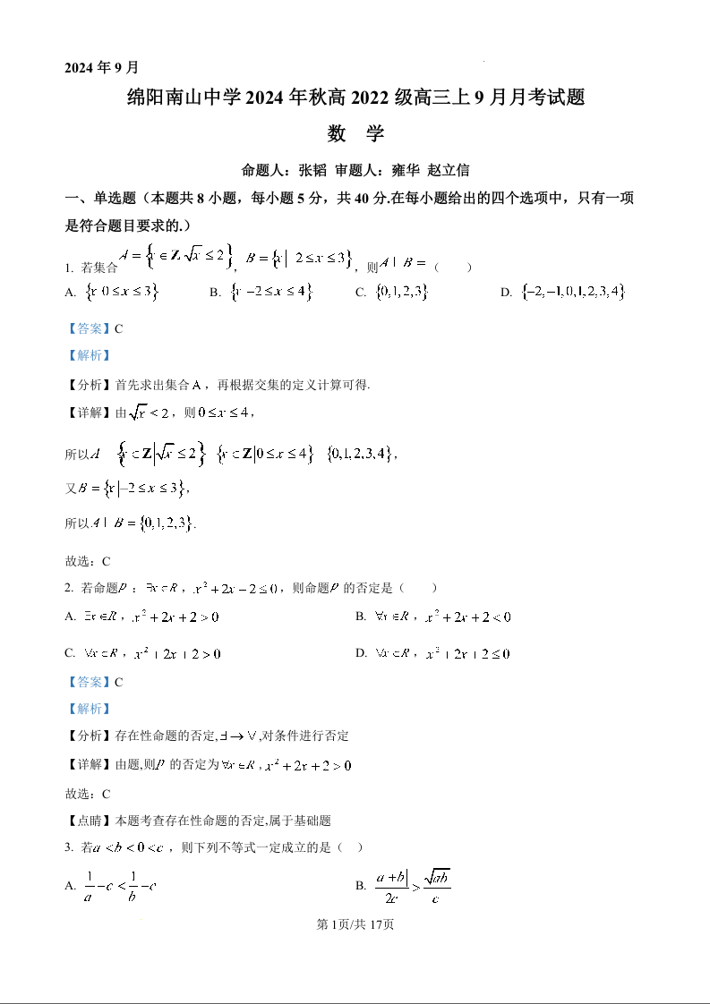 四川省绵阳市南山中学2024级秋季高2022级9月月考数学试题(解析版)