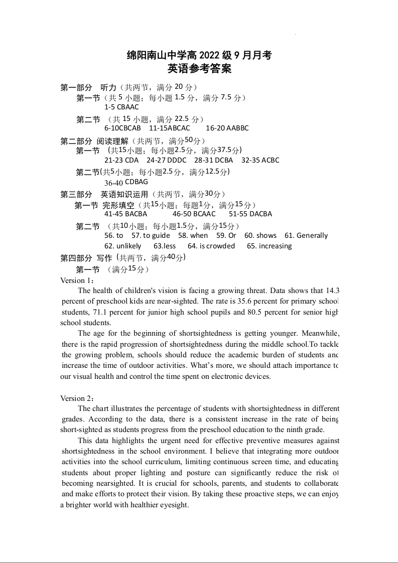 四川省绵阳市南山中学2024级秋季高2022级9月月考英语答案