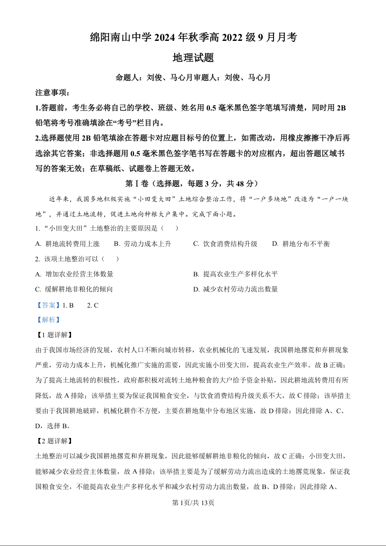 四川省绵阳市南山中学2024级秋季高2022级9月月考地理试题(解析版)