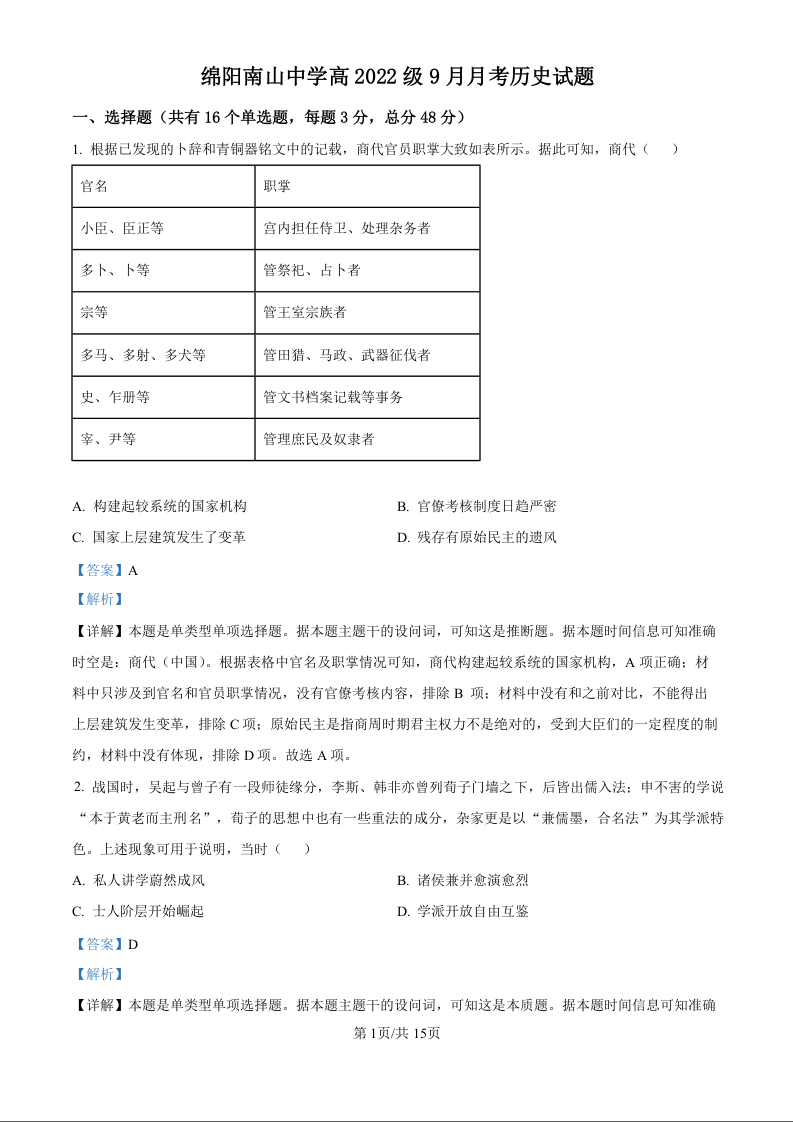 四川省绵阳市南山中学2024级秋季高2022级9月月考历史试题(解析版)