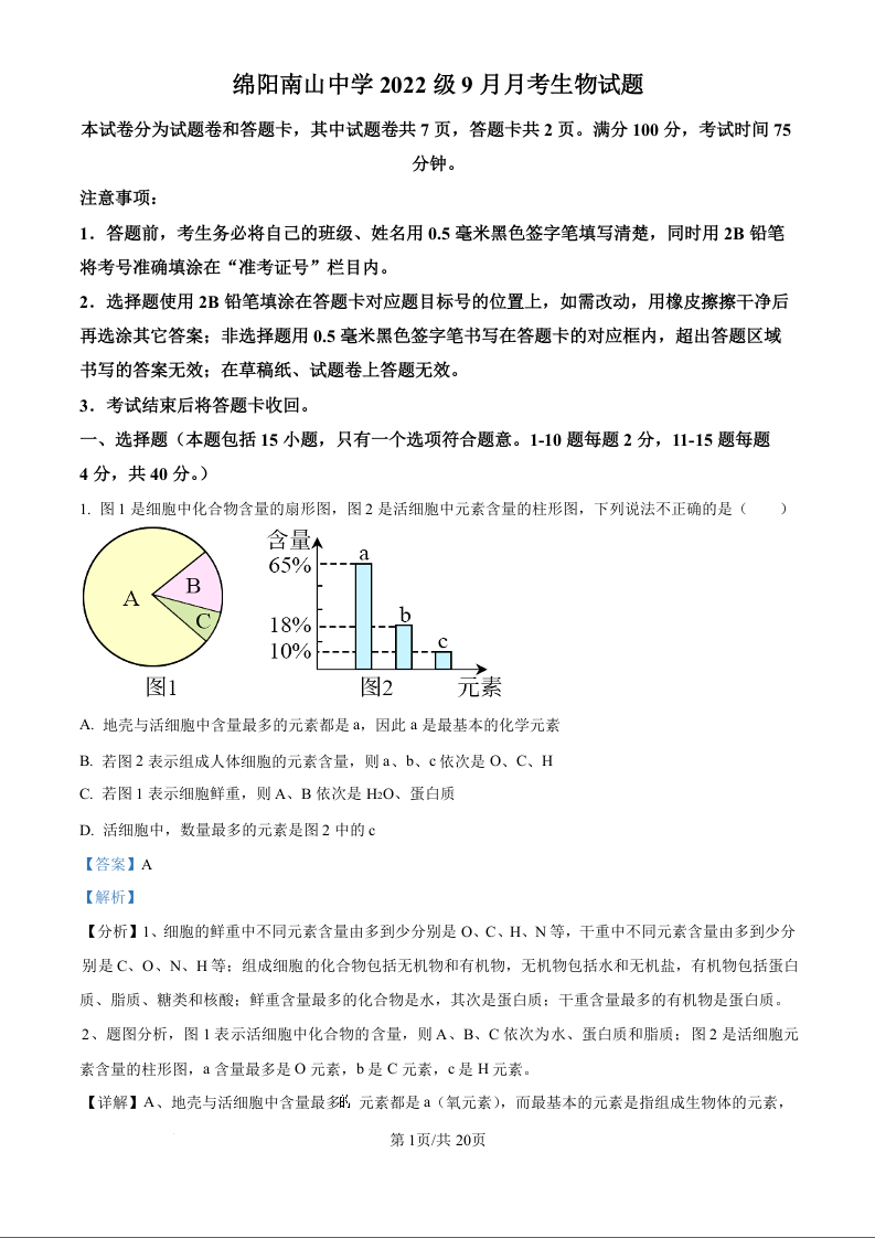 四川省绵阳市南山中学2024级秋季高2022级9月月考生物试题(解析版)