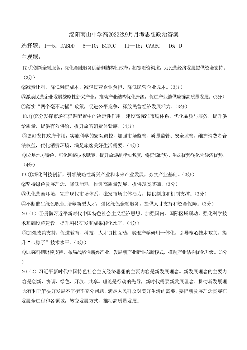 四川省绵阳市南山中学2024级秋季高2022级9月月考政治答案