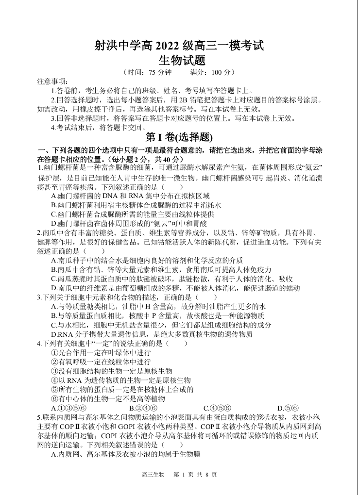 四川省遂宁市射洪中学高2022级高三一模考试生物