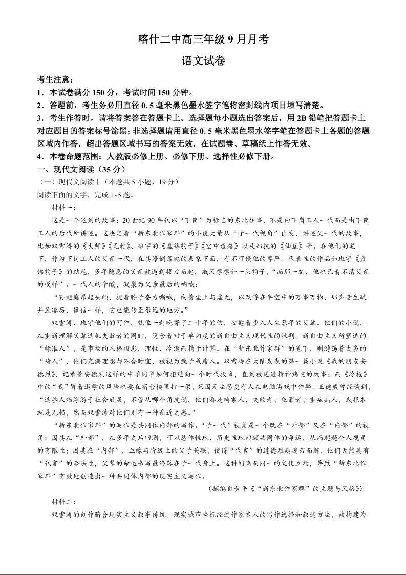 新疆维吾尔自治区喀什第二中学2025届高三9月份月考语文试卷+答案