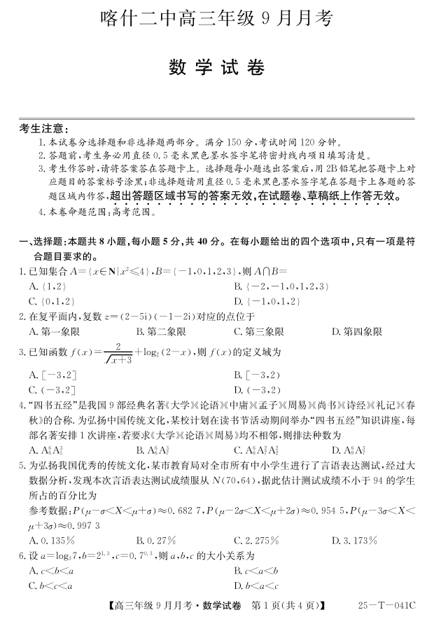 新疆维吾尔自治区喀什第二中学2025届高三9月份月考数学