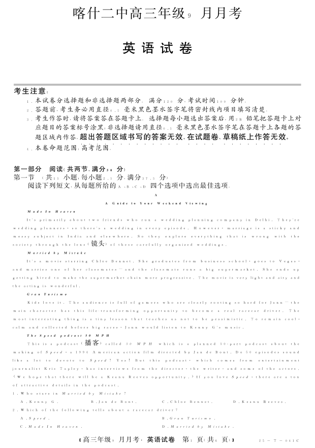 新疆维吾尔自治区喀什第二中学2025届高三9月份月考英语