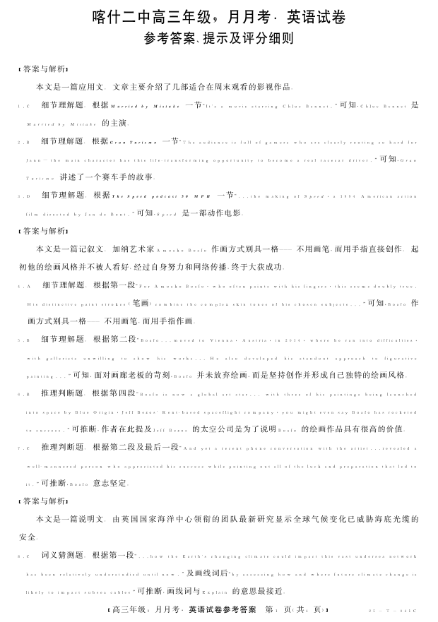 新疆维吾尔自治区喀什第二中学2025届高三9月份月考英语答案