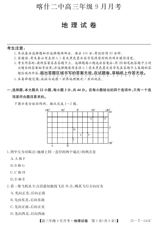 新疆维吾尔自治区喀什第二中学2025届高三9月份月考地理