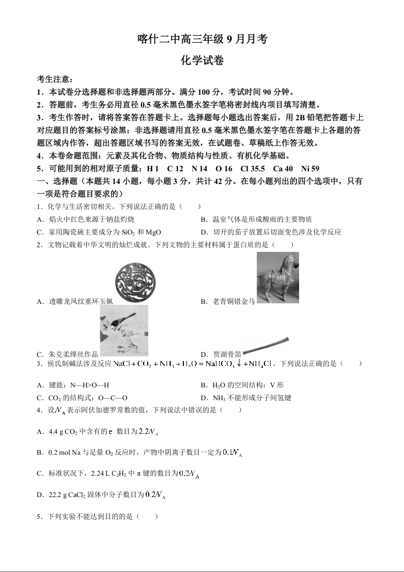 新疆维吾尔自治区喀什第二中学2025届高三9月份月考化学试卷+答案