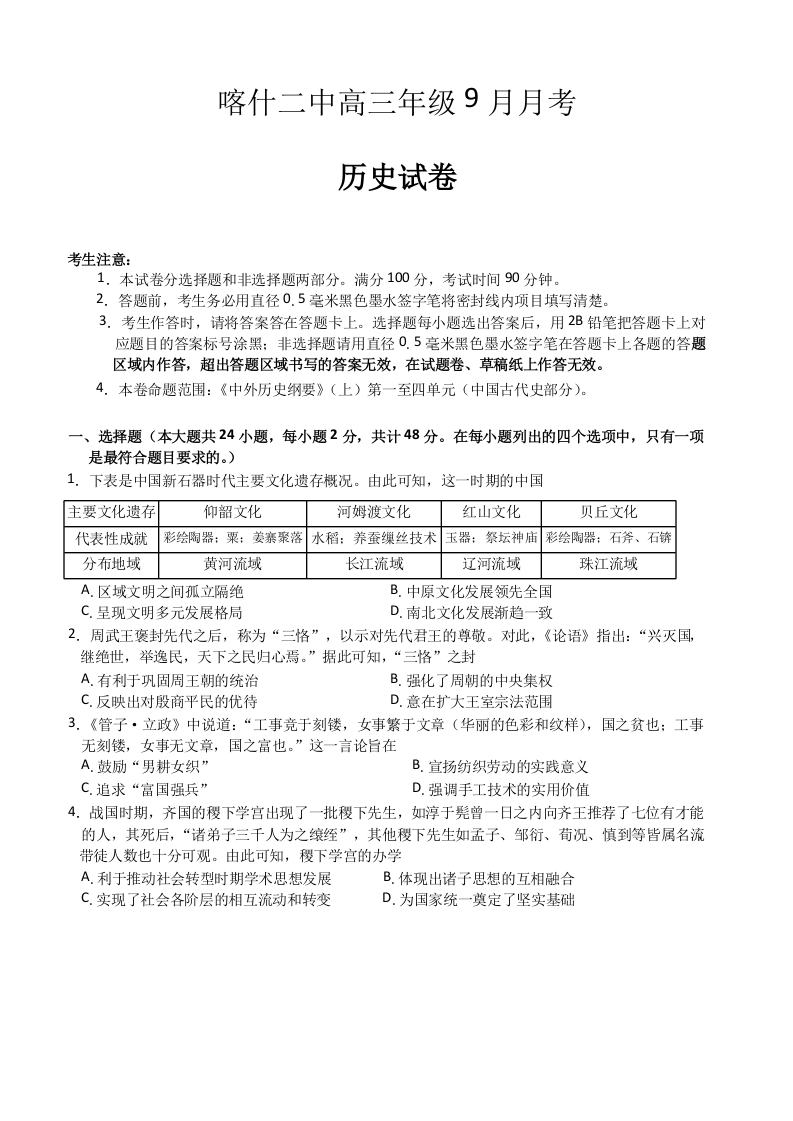 新疆维吾尔自治区喀什第二中学2025届高三9月份月考历史试卷+答案