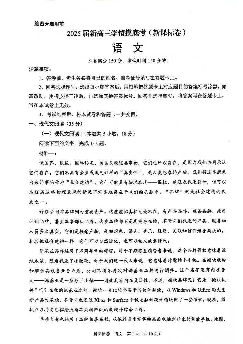 2025届新高三9月学情摸底考语文+答案