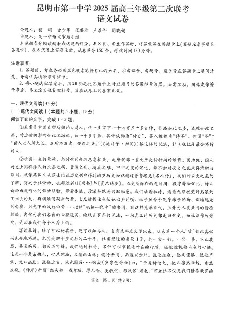 云南省昆明市第一中学2025届高三年纪第二次联考语文