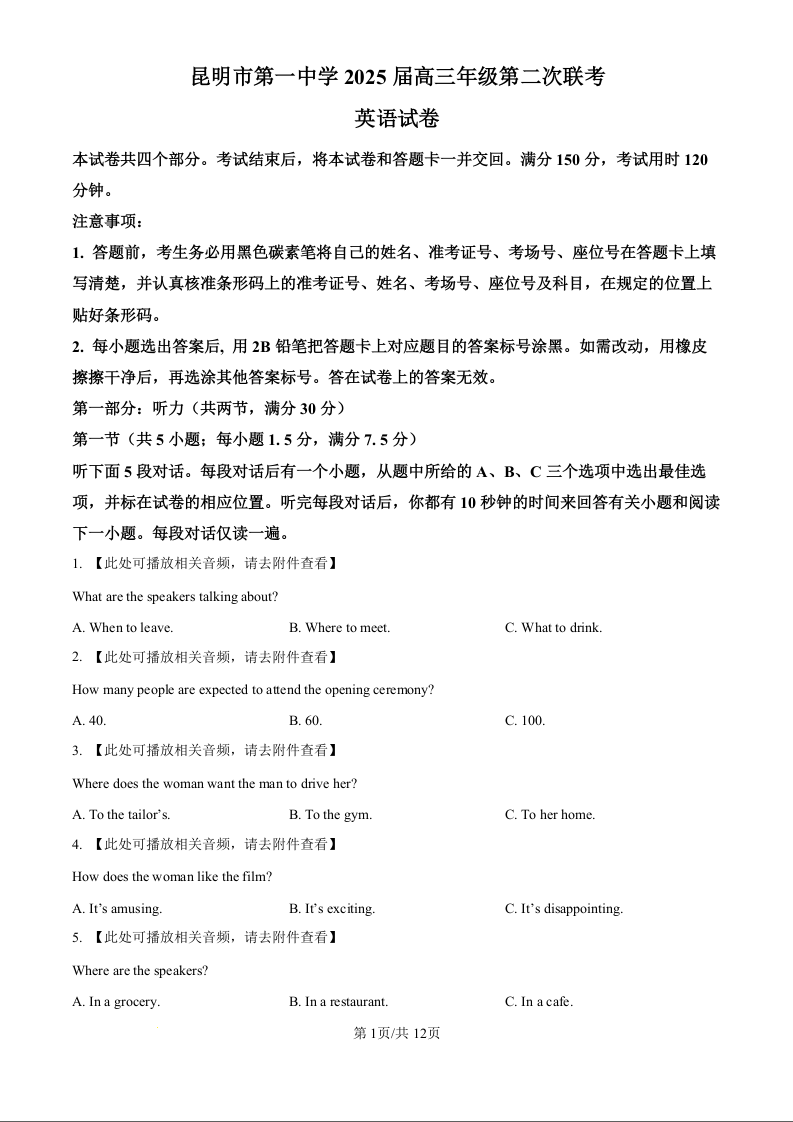 云南省昆明市第一中学2025届高三年纪第二次联考英语试题(原卷版)
