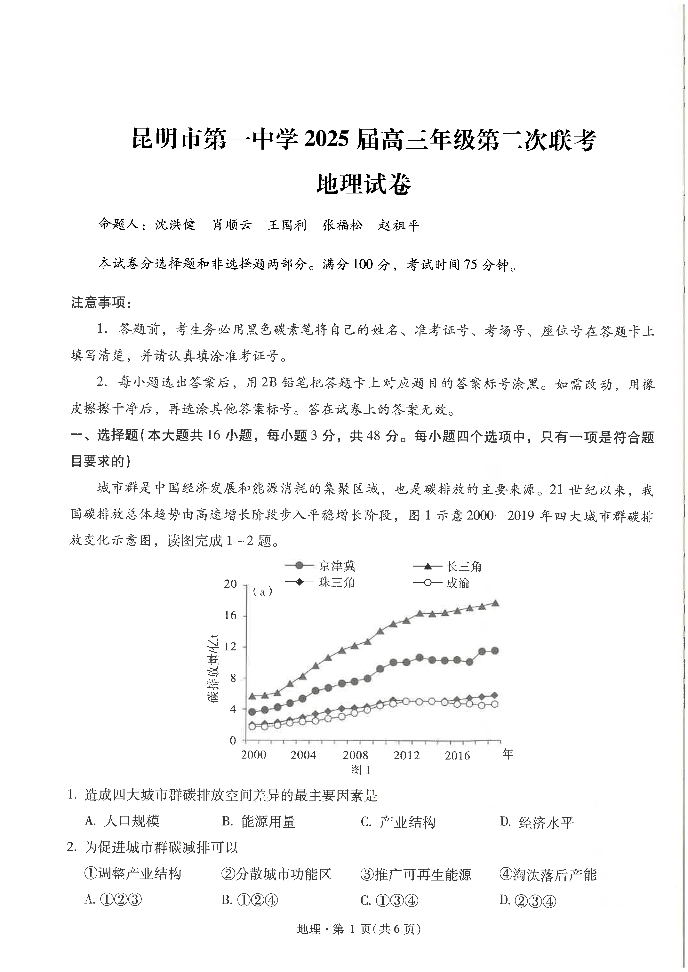 云南省昆明市第一中学2025届高三年纪第二次联考地理