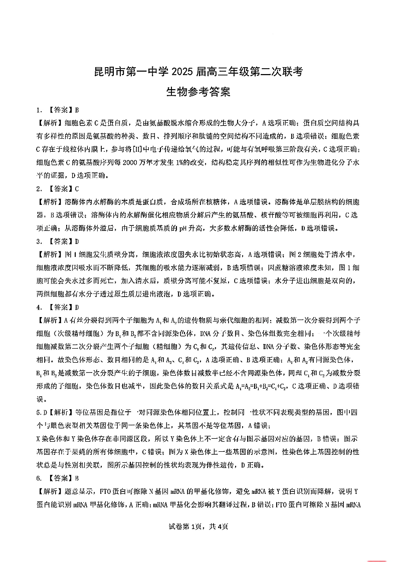 云南省昆明市第一中学2025届高三年纪第二次联考生物答案