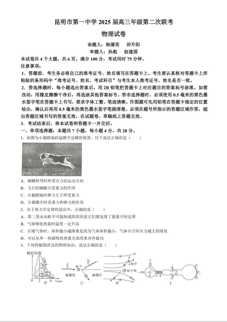 云南省昆明市第一中学2025届高三年纪第二次联考物理
