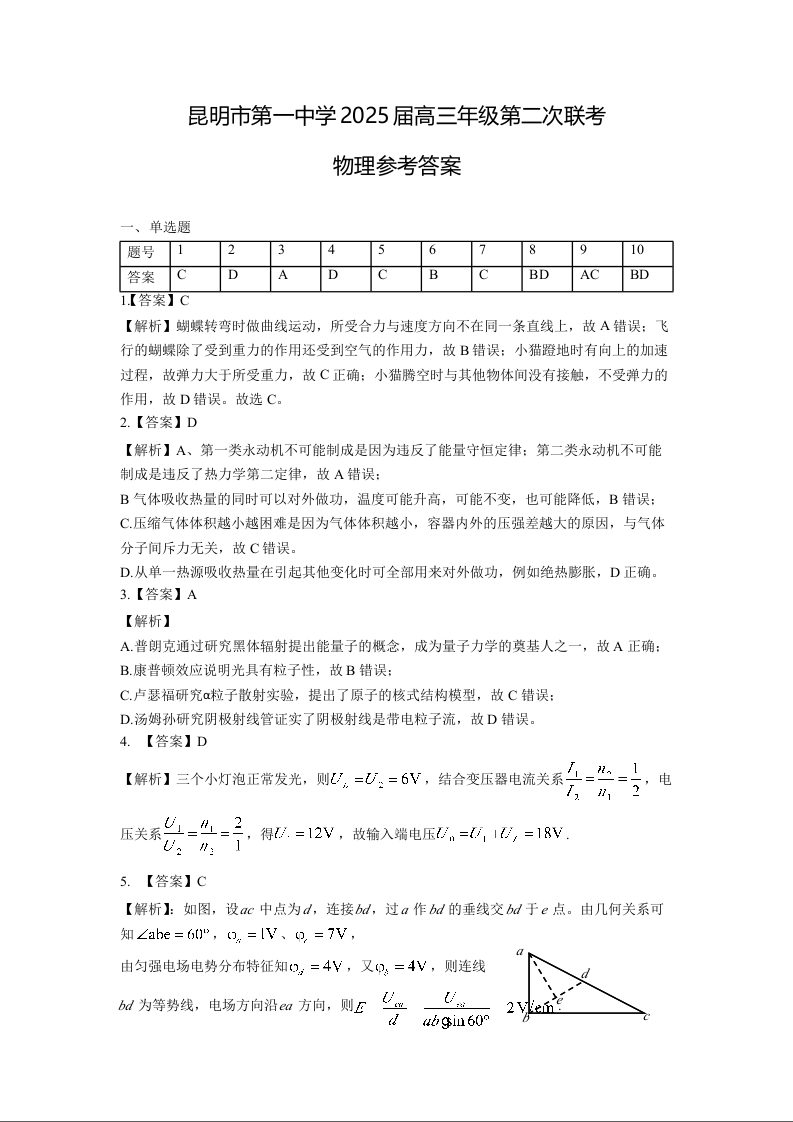 云南省昆明市第一中学2025届高三年纪第二次联考物理答案